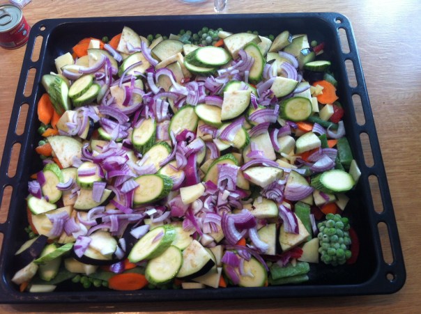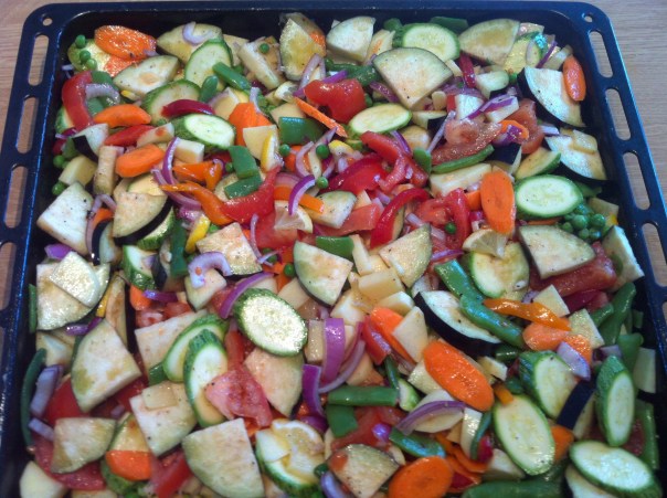 P.S. after 20mns get the tray out and mix the vegetables carefully to make sure that all the vegetables get their fair exposure to the heat. If you don’t, the top layer will “bake” nicely and the bottom one will be “steamed”.